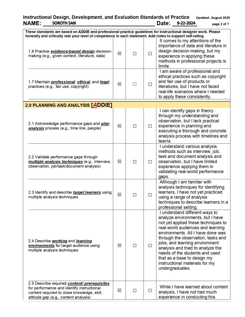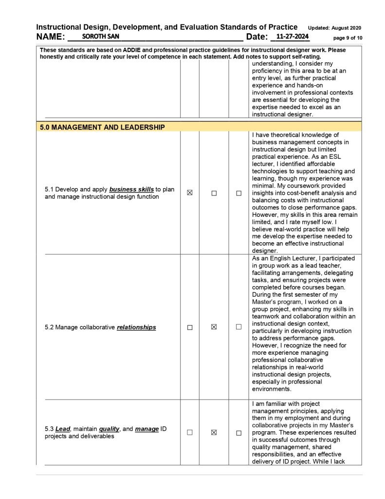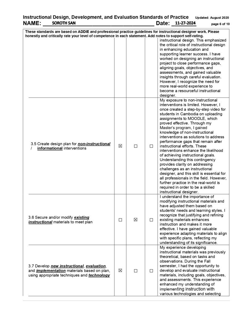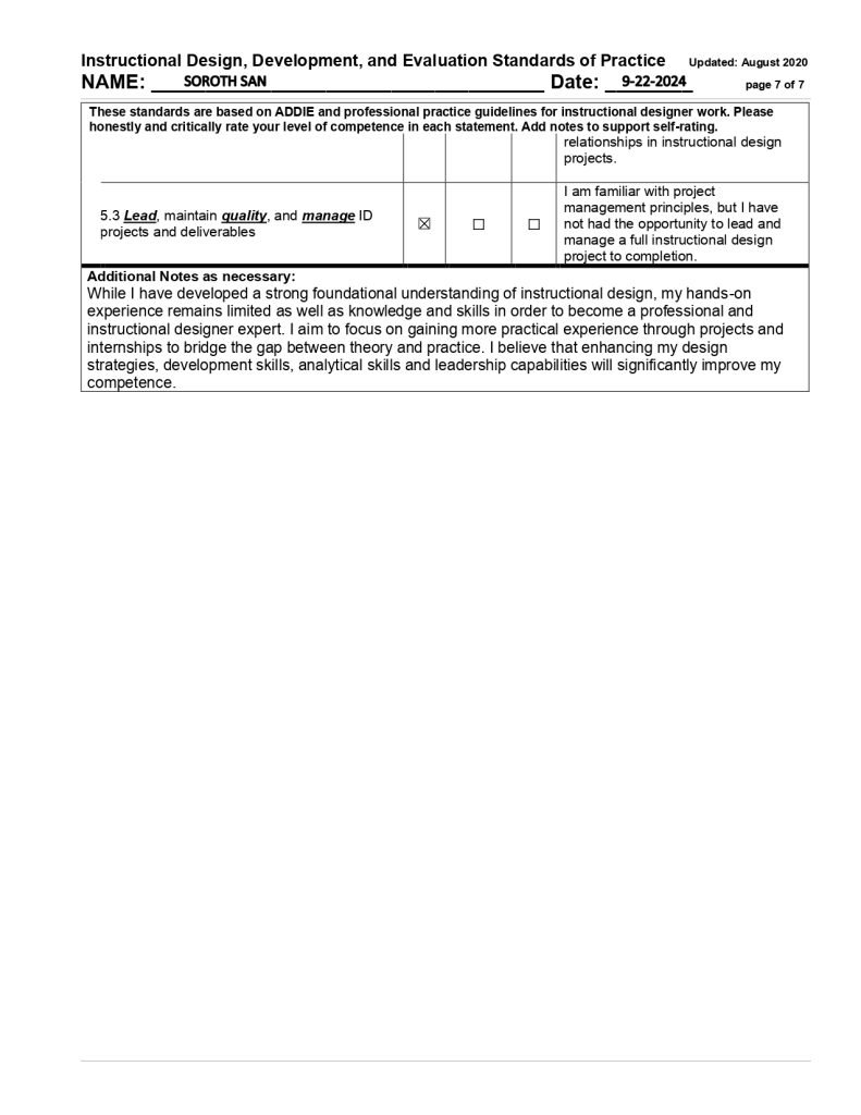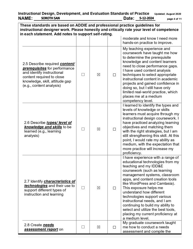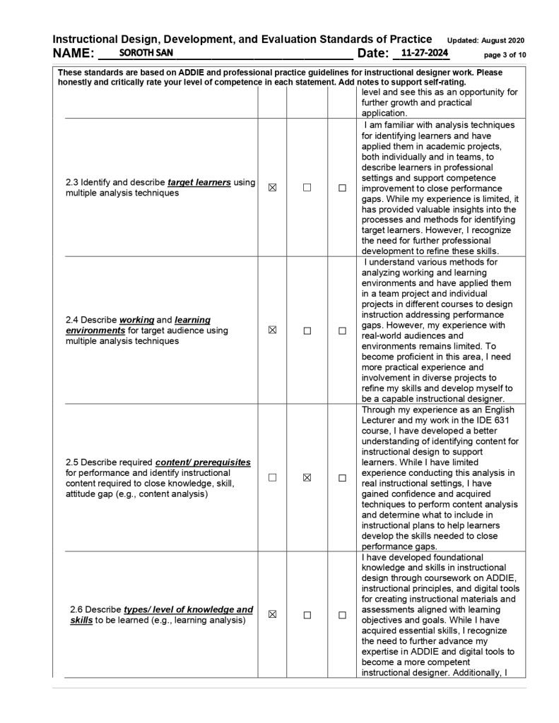 In my final self-assessment in May, I demonstrated substantial growth across multiple key competencies. I strengthened my communication skills (1.1) through collaborative projects with peers and through class presentations, achieving a high level of proficiency in this area. I also became more adept at conducting comprehensive needs assessments (2.8) to identify performance gaps and inform design decisions, evolving from an initially limited awareness to a confident application of this skill. Furthermore, I was able to create comprehensive instructional design plans and adapt learning materials for different audiences, reflecting the maturation of my design and development skills. Additionally, I improved significantly in evidence-based design decision-making (1.6) and maintained strong ethical practices (1.7) by integrating relevant research findings and data to guide effective instructional strategies. By the end of the program, I felt more confident in my capabilities as an instructional designer, while recognizing that continued practical experience is necessary to reach full professional competence. This pattern of growth was mirrored across other IDD&E competency domains as well, indicating that I experienced development throughout the program.
